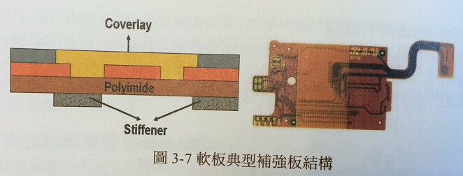 一般最常用于柔性電路板強化的做法,是采用背板固定模式,也有人稱這種背板強化叫補強板。所謂加背板,就是在必要強化的區(qū)域墊上較硬的材料,借以降低柔軟度并便利后續(xù)組裝。圖3-7所示,為柔性電路板典型補強固定結(jié)構(gòu)。用于強化的材料包括低價的膠板或金屬板,某些PI材料的強化會要求使用同種PI材料,以符合產(chǎn)品高信賴度要求,而某些要求較寬的產(chǎn)品則嘗試使用聚脂樹脂膠片作強化,以降低制作成本。