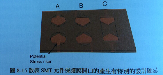 使用鉆孔或開槽、切形在壓合前將保護(hù)膜加工,是軟板制造焊錫襯墊近接區(qū)域的普遍方法。不過如果直接布線進(jìn)入襯墊,保護(hù)膜對位不良可能導(dǎo)至應(yīng)力提升。圖8-15(A)中,潛在的應(yīng)力提升狀況還是重覆出現(xiàn)。邊緣或轉(zhuǎn)角進(jìn)入襯墊有利于對位偏移的容忍度(圖8-15(B))。雷射切割或機(jī)械沖壓、切形加工的保護(hù)膜開口,可以做成矩形(圖8-15(C))。