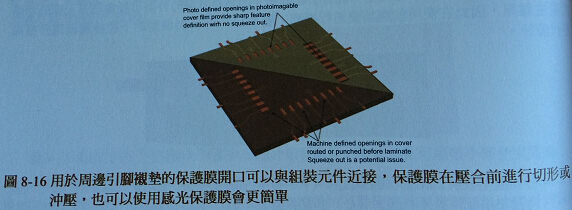 矩形開口也可以利用感光保護(hù)膜來完成,當(dāng)制作元件組裝近接襯墊時(shí),建議焊錫襯墊可以延伸到保護(hù)膜以下。用于散裝或有引腳的SMT元件襯墊,應(yīng)該要延伸到足以讓保護(hù)膜配位的程度。一般狀況襯墊應(yīng)該要大于250-375um,以方便襯墊配位避免組裝或修補(bǔ)襯墊浮起問題。