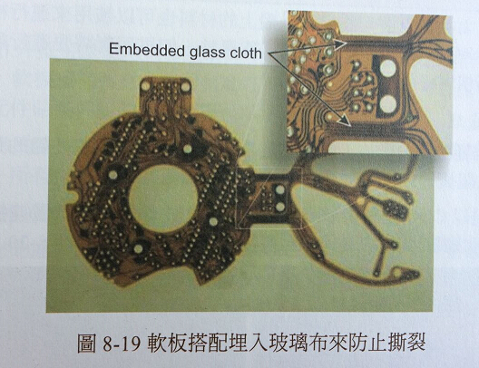 可以在制程中用玻璃布壓合在轉(zhuǎn)角上,這個方法經(jīng)過美國軍方產(chǎn)品驗證相當穩(wěn)定有效。不過它相當昂貴,因為相當費工且需要小心操作,還會影響到部分FPC柔軟性,目前還在找替代方案(參考圖8-19)。