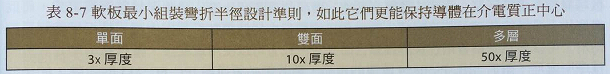 在每片柔性線路板上如果只在組裝時(shí)發(fā)生彎折,考慮采用最小彎折半徑可能是個(gè)好主意,一般的柔性線路板彎折半徑參考數(shù)據(jù),如表8-7所示。設(shè)計(jì)時(shí)應(yīng)該建構(gòu)出足夠的回線區(qū),并配置挖空的貼裝孔讓柔性線路板產(chǎn)生緩和曲線。