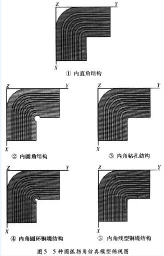 在三維電磁場仿真軟件HFSS中建立兩條耦合傳輸線及其他布線的仿真模型,5種不同的圓弧拐角結(jié)構(gòu)模型為:①內(nèi)直角結(jié)構(gòu)。②內(nèi)圓角結(jié)構(gòu)。③內(nèi)角鉆孔結(jié)構(gòu)。④內(nèi)角圓環(huán)銅堤結(jié)構(gòu)。⑤內(nèi)角線型銅堤結(jié)構(gòu)。如圖5所示。其中結(jié)構(gòu)①是未經(jīng)防撕裂處理的結(jié)構(gòu),結(jié)構(gòu)②~⑤都是為了防止FPC軟板拐角處撕裂,增強(qiáng)軟板強(qiáng)度的常見設(shè)計(jì)結(jié)構(gòu)。