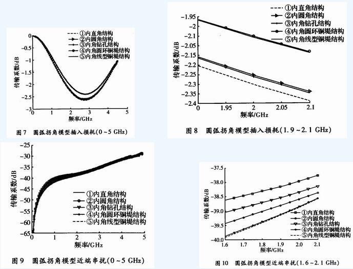 截取頻率1.5~2.1 GHz的近端串?dāng)_進(jìn)行比較,如圖10所示。在頻率為2 GHz時(shí),與內(nèi)直角結(jié)構(gòu)相比,影響最小的結(jié)構(gòu)為③,由內(nèi)圓角結(jié)構(gòu)增加的近端串?dāng)_為0.45 dB。影響最大的結(jié)構(gòu)為⑤,內(nèi)角圓環(huán)銅堤結(jié)構(gòu)的近端串?dāng)_為0.9 dB。