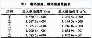 通過仿真得到5種不同結(jié)構(gòu)下的FPC表面的電場強(qiáng)度和磁場強(qiáng)度的最大值,如表1所示。