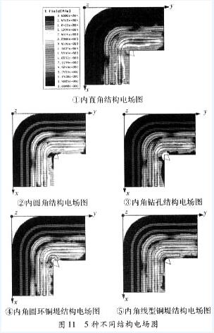 從表1中可以明顯的看出防撕裂的4種結(jié)構(gòu)的最大電場磁強(qiáng)度值,最大磁場強(qiáng)度值都小于內(nèi)直角結(jié)構(gòu),其中內(nèi)圓角結(jié)構(gòu)的最大電場磁強(qiáng)度值,最大磁場強(qiáng)度值最理想。