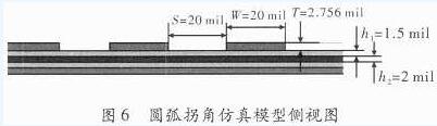 FPC軟板的結(jié)構(gòu)從上到下依次為銅印制線、粘結(jié)膠、聚酰亞胺薄膜、粘結(jié)膠和參考地,如圖6所示。銅印制線厚度T=70μm=2.756 mil,線寬W=20 mil,間距S=20 mil,兩段耦合線長L1=L2=220 mil。粘結(jié)膠的介電常數(shù)為εr=4.0,厚度為h=1.5 mil;聚酰亞胺基材的介電常數(shù)為εr=3.4,厚度為h=2 mil。
