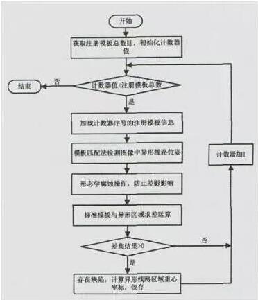 異形線路屬于FPC上的不規(guī)則形狀,一般包括LED燈、S型圓等;由于與外設(shè)形狀相關(guān),其布線一般與待檢FPC的樣式結(jié)構(gòu)有關(guān)。針對這類線路,考慮模板匹配方式實施檢測:首先通過模板匹配法粗步定位出各個異形線路在整塊FPC上的位姿,獲取異形線路輪廓;再基于形態(tài)學(xué)理論進(jìn)行缺陷檢測。有關(guān)異形線路的檢測流程見下圖。