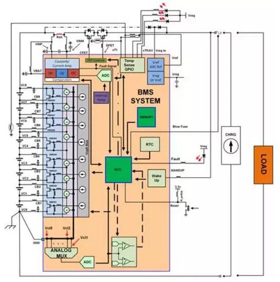 電池管理系統(tǒng)(BMS)主要分為兩部分,第一部分是前端模擬測量保護電路(AFE),包括電池電壓轉換與量測電路、電池平衡驅動電路、開關驅動電路、電流量測、通訊電路;第二部分是后端數(shù)據(jù)處理模塊,就是依據(jù)電壓、電流、溫度等前端計算,并將必要的信息通過通信接口回傳給系統(tǒng)做出控制。