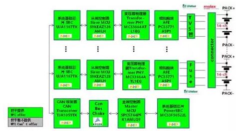 汽車FPC導讀:電池管理系統(tǒng)(BMS)是電動汽車的核心關鍵技術,其主要分為兩部分,第一部分是前端模擬測量保護電路 (AFE),包括電池電壓轉換與量測電路、電池平衡驅動電路、開關驅動電路、電流量測、通訊電路;第二部分是后端數(shù)據(jù)處理模塊,就是依據(jù)電壓、電流、溫度等前端計算,并將必要的信息通過通信接口回傳給系統(tǒng)做出控制。目前電動汽車的電池管理系統(tǒng)(BMS)產(chǎn)品設計方案,被國外廠商壟斷,都選用國外半導體IC廠商提供的電池管理IC,并以其應用方案為參考進行設計。