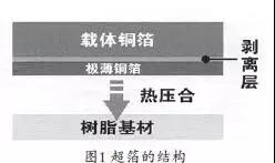 形成模塊基本(IC載板)或智能手機(jī)用的微細(xì)電路圖形,若采用蝕刻工藝由于會產(chǎn)生側(cè)蝕而影響微細(xì)導(dǎo)體圖形的形成,而采用半加成法或UTC(Ultra-Clad超薄銅箔法)。軟板廠所用UTC法采用的銅箔厚度是3μm左右極薄箔材。通常覆銅板的銅箔厚度即使薄也常是12μm厚,這種12μm厚度的銅箔如作為UTC法之用,也會產(chǎn)生較大側(cè)蝕而達(dá)不到要求。由于3μm厚的超薄銅箔難于直接使用操作,大都是采用如圖1所示用載體銅箔作襯里的超薄銅箔。將這種材料壓合于基板上以后剝?nèi)ポd體銅箔,然后形成導(dǎo)體圖形。
