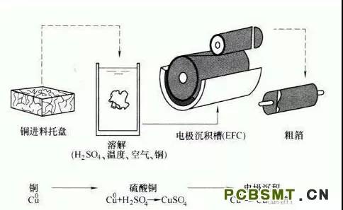電解過程開始是將銅從硫酸溶液中分解出來,通過溫度和攪動(dòng)來控制分解率。銅箔的外形和力學(xué)性能可能過使用不同類型的添加劑加以控制。