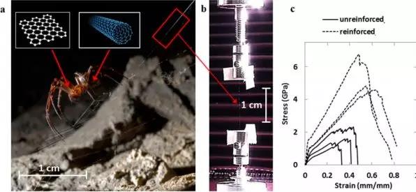 科學(xué)家使用碳納米管和石墨烯,可以使普通的蜘蛛絲變得更強(qiáng)韌。意大利特倫托大學(xué)的Nicola Pugno教授帶領(lǐng)的一個研究團(tuán)隊,成功地使蜘蛛吐出的蛛絲強(qiáng)度提升了3倍,韌性提升了10倍。