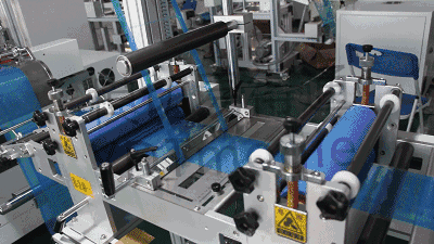 1、放料機放料藍色托底離型膜,(注意:此處離型膜為覆合后的雙層離型膜)托底離型膜由主機進料架進入上異步模切機,經(jīng)過沖切平臺再進入拉料系統(tǒng)。