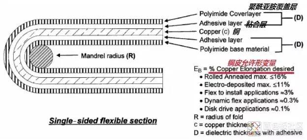而且在不同的使用場(chǎng)合,同一材料的銅皮變形量取值也不一樣。對(duì)于一次性彎曲的的場(chǎng)合,使用折斷臨界狀態(tài)的極限值(對(duì)延碾銅,該值為16%)。對(duì)于彎曲安裝設(shè)計(jì)情況,使用IPC-MF-150規(guī)定的最小變形值(對(duì)延碾銅,該值為10%)。對(duì)于動(dòng)態(tài)柔性應(yīng)用場(chǎng)合,銅皮變形量用0.3%。而對(duì)于磁頭應(yīng)用,銅皮變形量用0.1%。