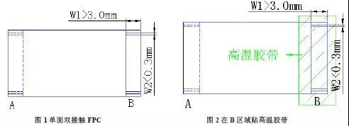 如圖1所示,當(dāng)單面雙接觸的軟板電極長度大于3.0mm,寬度小于0.3mm時,在制程當(dāng)中(蝕刻、去膜、表面清洗、貼保護(hù)膜)容易造成電極變形、扭曲、斷裂,嚴(yán)重影響了產(chǎn)品的良率。