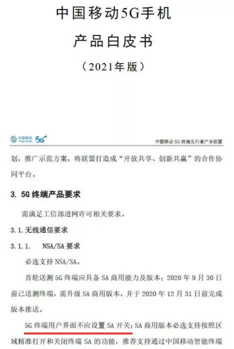 中國(guó)移動(dòng)更是不講武德,甚至還要求:手機(jī)系統(tǒng)中不應(yīng)設(shè)置 SA 開關(guān)。