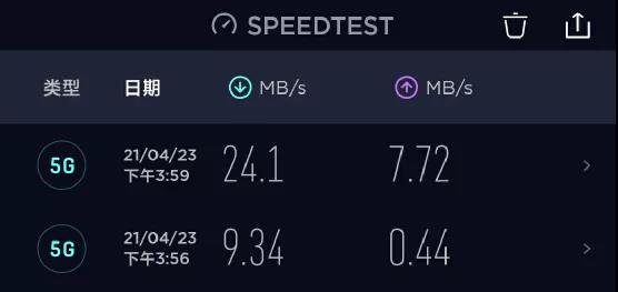 經(jīng)過測(cè)試,在室內(nèi) 5G 信號(hào)較差的環(huán)境下,速度提升依然明顯。