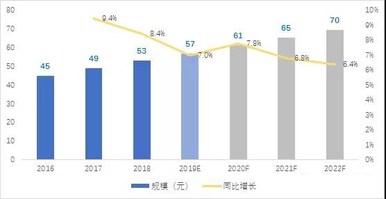 2018年汽車用柔性線路板(FPC)市場(chǎng)規(guī)模達(dá)53億元,同比增長(zhǎng)8.4%,市場(chǎng)的主要增長(zhǎng)動(dòng)力來(lái)源于汽車電子化程度的提升和新能源汽車滲透率的提升。預(yù)計(jì)2019年全球市場(chǎng)規(guī)模將達(dá)57億元,同比增長(zhǎng)7.0%。2016-2022年,汽車用FPC的年增長(zhǎng)速度長(zhǎng)期維持在6%-9%之間,至2022年汽車FPC市場(chǎng)規(guī)模將增長(zhǎng)至70億元。