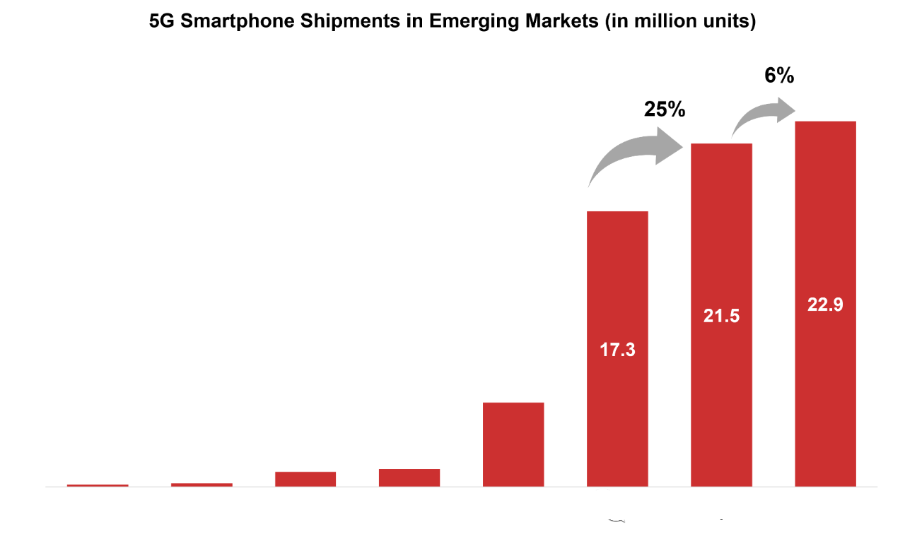 在智能手機(jī)成熟市場,消費(fèi)者已經(jīng)對5G形成認(rèn)知,認(rèn)為新的智能手機(jī)產(chǎn)品理所應(yīng)當(dāng)支持5G功能。這種觀念還沒有得到大多數(shù)新興市場消費(fèi)者的認(rèn)可。不過,新興市場卻具有最大5G增長潛力。