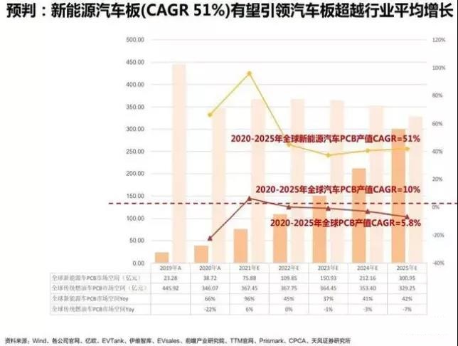 汽車四化帶動汽車板空間擴大:汽車FPC PCB有望實現(xiàn)超越行業(yè)平均增速增長,預計新能源汽車板2020~2025年市場空間CAGR為51%。
