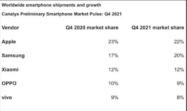 數(shù)據(jù)研究機(jī)構(gòu)Canalys發(fā)布的最新報(bào)告顯示,蘋果手機(jī)在2021年占全球智能手機(jī)出貨量的22%,坐上全球智能手機(jī)市場(chǎng)的頭把交椅,三星以20%的市場(chǎng)份額緊隨其后。