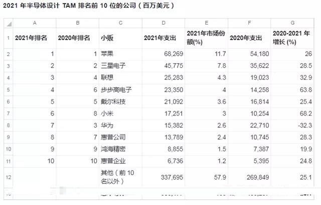 近日,Gartner 發(fā)布了 2021 年排名前 10 位的半導(dǎo)體芯片買家。這十位買家分別是蘋果、三星、聯(lián)想、步步高電子、戴爾、小米、華為、惠普、鴻海精密和 HPE。