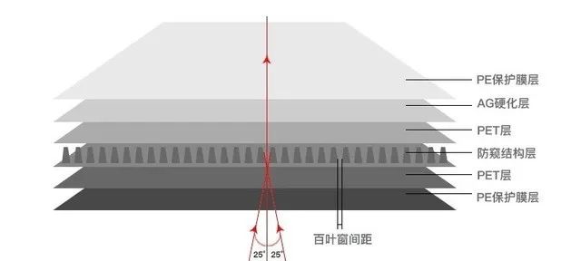 防窺膜之所以防窺,是因為有一層防窺結(jié)構(gòu),這層結(jié)構(gòu)類似于百葉窗,原理叫“超微細百葉窗光學技術(shù)”。有了這個技術(shù),超過一定角度的光線會被阻擋,因此斜著看我們無法看到手機屏幕內(nèi)容。