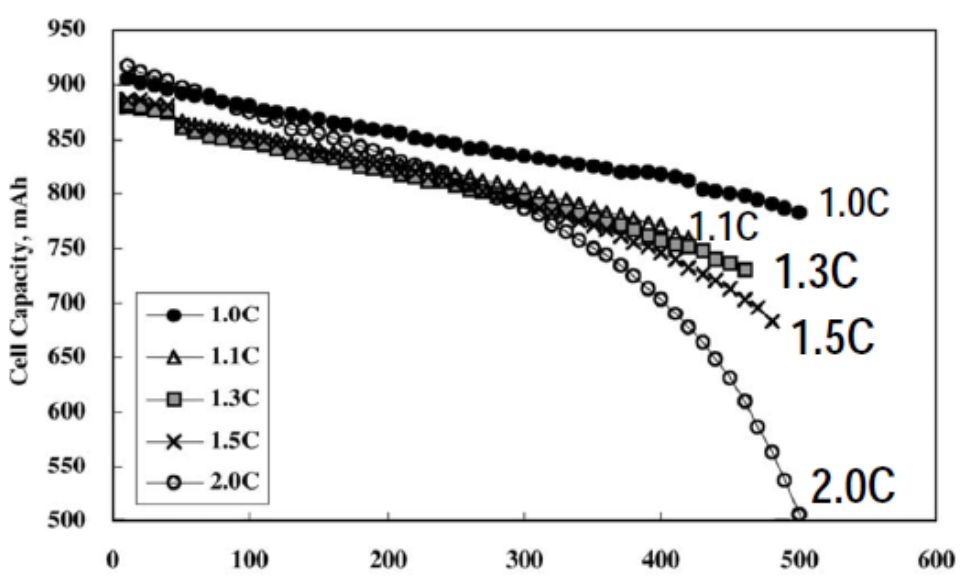 恒流充電的電流大多設(shè)定在1C左右(按照500個(gè)使用循環(huán)后容量衰減至初始容量的80%確定)。