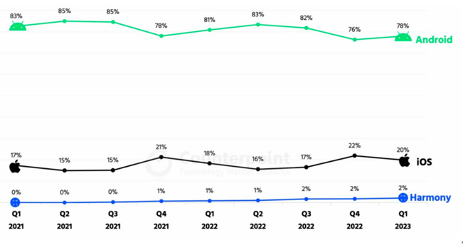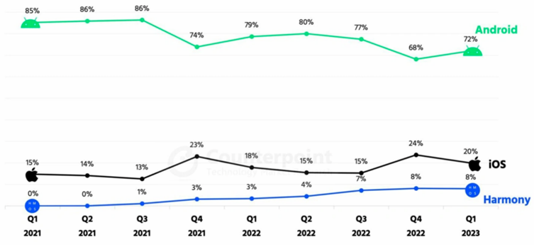 就國(guó)內(nèi)市場(chǎng)來(lái)看,安卓在今年第一季度的份額占比為72%,蘋(píng)果iOS的占比為20%,華為的份額占比則提升至8%,并據(jù)此成為國(guó)內(nèi)市場(chǎng)的第三大手機(jī)操作系統(tǒng)。綜合這份報(bào)告中給出的數(shù)據(jù)信息來(lái)看,2021年第三季度,華為鴻蒙系統(tǒng)在國(guó)內(nèi)市場(chǎng)的份額達(dá)到1%,并在之后的一個(gè)季度提升至3%。隨后的2022年第二季度,鴻蒙的市場(chǎng)份額占比再次上升,達(dá)到4%;2022年第三季度增長(zhǎng)至7%,2022年第四季度達(dá)到8%。就此來(lái)看,華為的鴻蒙操作系統(tǒng)在手機(jī)市場(chǎng)中的份額占比一直處在穩(wěn)定提升的過(guò)程中。