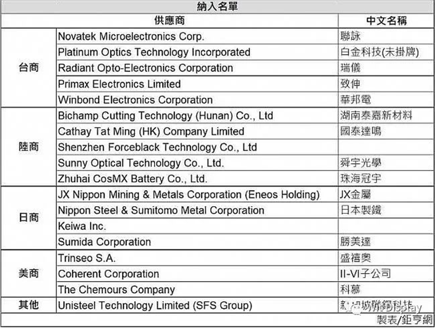 新增進(jìn)入蘋果供應(yīng)鏈的10家中國廠商分別為:湖南泰嘉新材料、國泰達(dá)鳴、舜宇光學(xué)、珠海冠宇及深圳墨力科技(Shenzhen Forceblack Technology),以及來自中國臺(tái)灣的聯(lián)詠、華邦電子、瑞儀、致伸及白金科技。值得一提的是,聯(lián)詠、華邦電、白金科技是首度進(jìn)入蘋鏈,瑞儀與致伸則是重回蘋果供應(yīng)鏈。