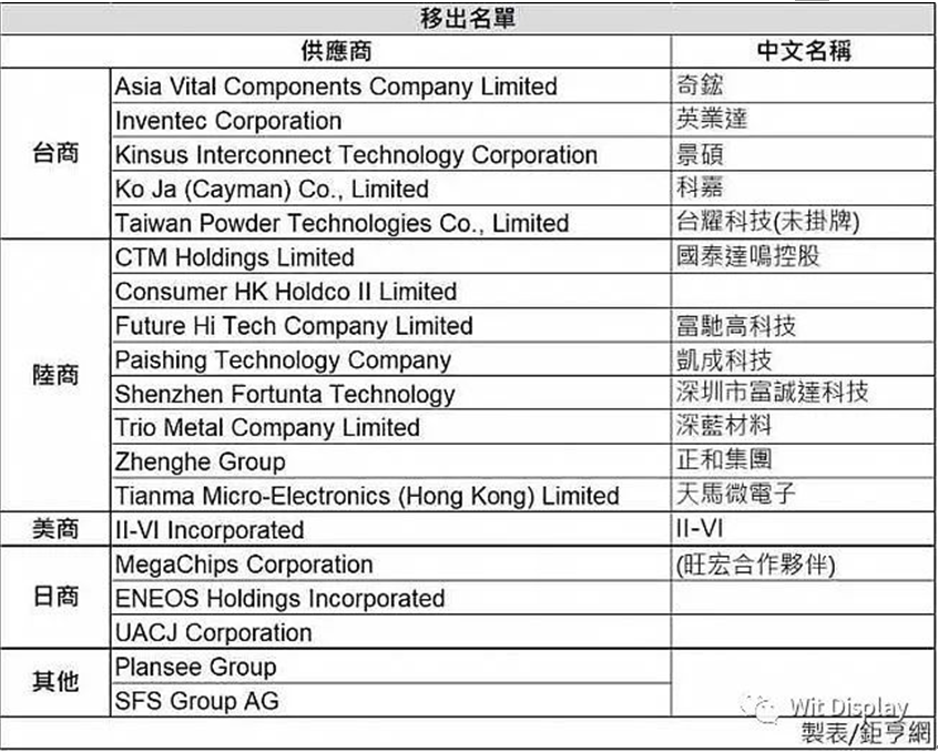 手機(jī)無線充軟板廠深深了解到,被剔除出蘋果供應(yīng)鏈的8家中國廠商分別為:CTM Holdings Limited、Consumer HK Holdco II Limited、富馳高科技、凱成科技、深圳市富誠達(dá)科技、深藍(lán)材料、正和集團(tuán)、天馬微電子,以及中國臺(tái)灣的奇鋐、英業(yè)達(dá)、景碩、科嘉及臺(tái)耀科技。值得注意的是,去年科嘉與臺(tái)耀科技才剛加入蘋鏈,今年就被移出。