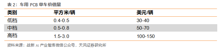 PCB單車(chē)價(jià)值量目前不高,預(yù)計(jì)未來(lái)有望隨汽車(chē)新四化的推動(dòng)不斷提升。根據(jù)戰(zhàn)新AI產(chǎn)業(yè)智庫(kù)的數(shù)據(jù),截止2019年7月,低檔、中檔和高檔汽車(chē)單臺(tái)PCB的價(jià)值分別為30-40美元、50-70美元和100-150美元。我們預(yù)計(jì)未來(lái)隨著汽車(chē)新四化的不斷推進(jìn),單車(chē)PCB的價(jià)值量有望持續(xù)提升。