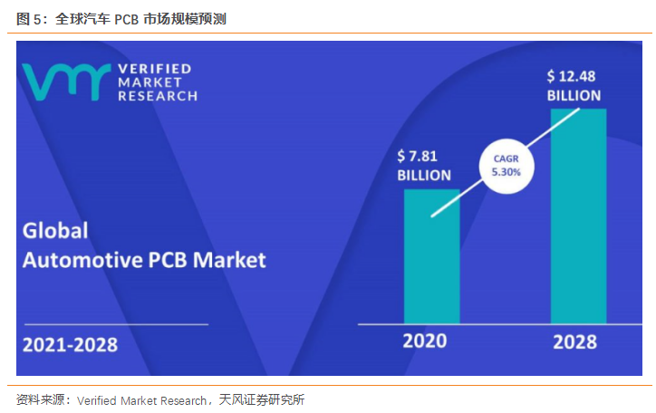 全球汽車(chē)PCB市場(chǎng)持續(xù)保持增長(zhǎng)。根據(jù)Verified Market Research預(yù)測(cè),2021-2028年汽車(chē)PCB市場(chǎng)將保持增長(zhǎng),區(qū)間CAGR為5.30%。市場(chǎng)規(guī)模將由2020年78.1億美金提升至2028年124.8億美金。