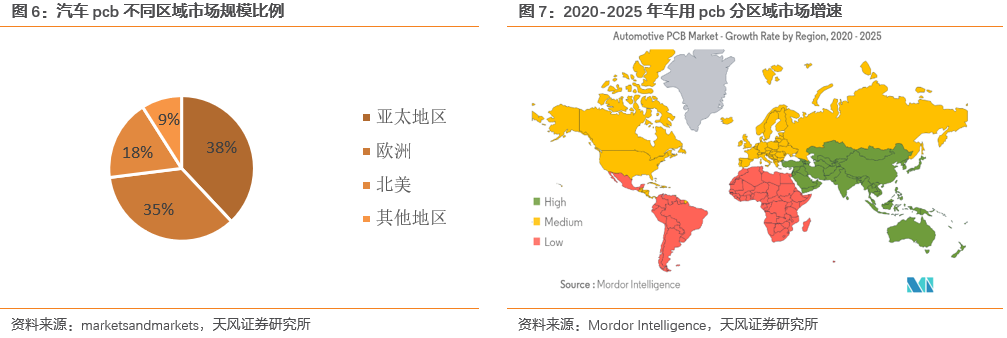 亞太地區(qū)是規(guī)模最大市場(chǎng),同時(shí)是增長(zhǎng)最快的市場(chǎng)。分區(qū)域來(lái)看,亞太地區(qū)車(chē)用PCB市場(chǎng)規(guī)模位列全球首位,占據(jù)全球38%的市場(chǎng)份額,同時(shí)根據(jù)Mordor Intelligence的預(yù)測(cè),未來(lái)亞太地區(qū)市場(chǎng)將成為增速最高的市場(chǎng)。其中我們認(rèn)為,中國(guó)市場(chǎng)也將成為快速增長(zhǎng),充滿機(jī)遇的市場(chǎng)。