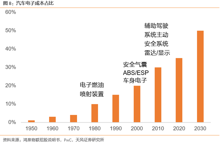 汽車(chē)電子在整車(chē)中成本占比逐漸提升。汽車(chē)電子滲透率不斷提升,電子化趨勢(shì)明顯。預(yù)計(jì)2030年達(dá)到50%左右滲透率。汽車(chē)電子成本占比提升主要源于: