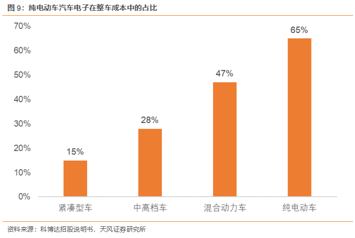2)電動(dòng)化浪潮下新能源汽車(chē)加速滲透,單車(chē)電子零部件成本占比相較傳統(tǒng)汽車(chē)至少翻倍,電子裝置在傳統(tǒng)高級(jí)轎車(chē)中的成本占比約為 25%,在新能源車(chē)中則達(dá)到 45%-65%;