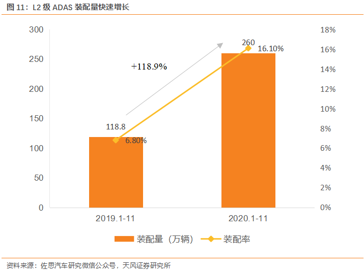 ADAS滲透率持續(xù)提升,未來(lái)預(yù)計(jì)裝配量仍將持續(xù)增長(zhǎng)。根據(jù)佐思汽研的數(shù)據(jù),2020年1-11月份配備L2級(jí)自動(dòng)駕駛功能的乘用車(chē)上險(xiǎn)量260.0萬(wàn)輛,同比增長(zhǎng)118.9%;裝配率16.1%,比上年同期增加9.3個(gè)百分點(diǎn)。盡管受多重負(fù)面影響,L2裝配量實(shí)現(xiàn)逆勢(shì)上漲,市場(chǎng)表現(xiàn)出需求強(qiáng)勁。