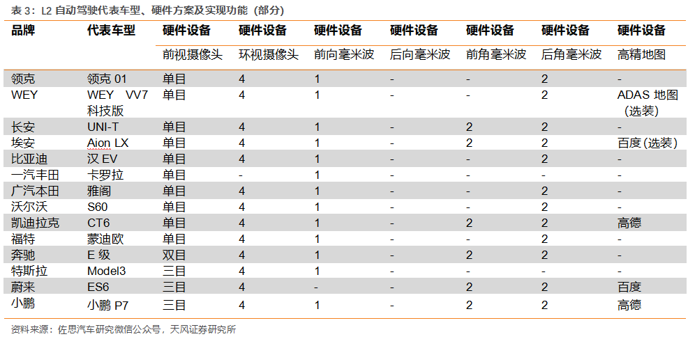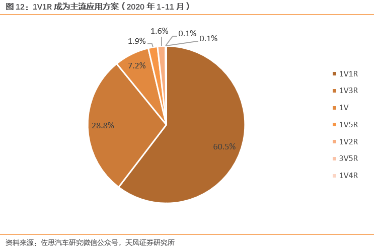 自動(dòng)駕駛驅(qū)動(dòng)攝像頭與雷達(dá)需求,1V1R目前為主流應(yīng)用。根據(jù)佐思汽研的數(shù)據(jù),2020年1-11月,L2級(jí)功能的主流方案有1V1R(1攝像頭+1前向毫米波雷達(dá))、1V3R(1攝像頭+1前向毫米波雷達(dá)+2后角雷達(dá))兩種,合計(jì)市場(chǎng)占比到89.3%,其中1V1R方案占比最大,為60.5%。造車(chē)新勢(shì)力以及部分車(chē)企采用了2后角雷達(dá),預(yù)計(jì)未來(lái)攝像頭與毫米波/激光雷達(dá)的應(yīng)用量將增加。