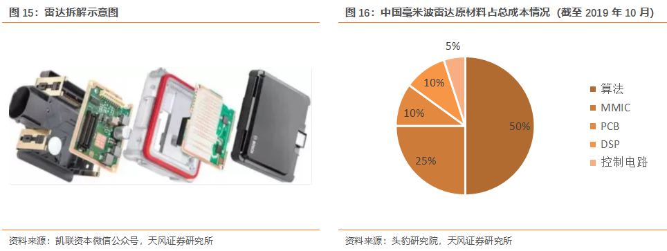 毫米波雷達(dá)基于PCB構(gòu)成。毫米波雷達(dá)的構(gòu)成中包括控制電路、DSP、算法、PCB等,PCB為其中的基礎(chǔ)支撐,對(duì)于毫米波雷達(dá)的性能具有重要的影響。根據(jù)頭豹研究院數(shù)據(jù),截至2019年10月,中國(guó)毫米波雷達(dá)成本構(gòu)成中,PCB占約10%的比例。