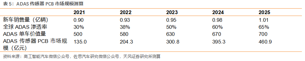 FPC廠由此計(jì)算得到2021-2025年全球ADAS傳感器PCB市場(chǎng)規(guī)模分別為135.0/204.3/300.8/395.3/460.9億元,期間CAGR達(dá)到35.9%。
