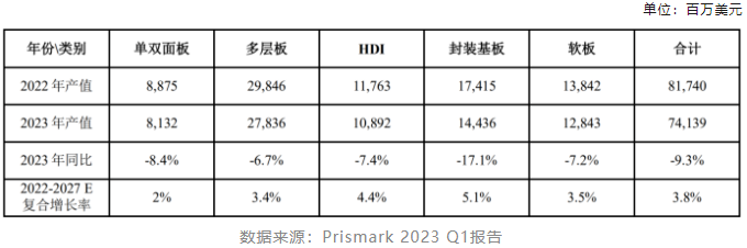 FPC廠了解到,受智能手機、PC等傳統(tǒng)消費電子需求疲軟等因素影響,2022年開始PCB整體需求轉(zhuǎn)弱。根據(jù)Prismark 2023年第一季度報告,2023年全球PCB產(chǎn)業(yè)以美元計價的產(chǎn)值將同比降低9.3%,較去年第四季度的預測下滑5.2個百分點。