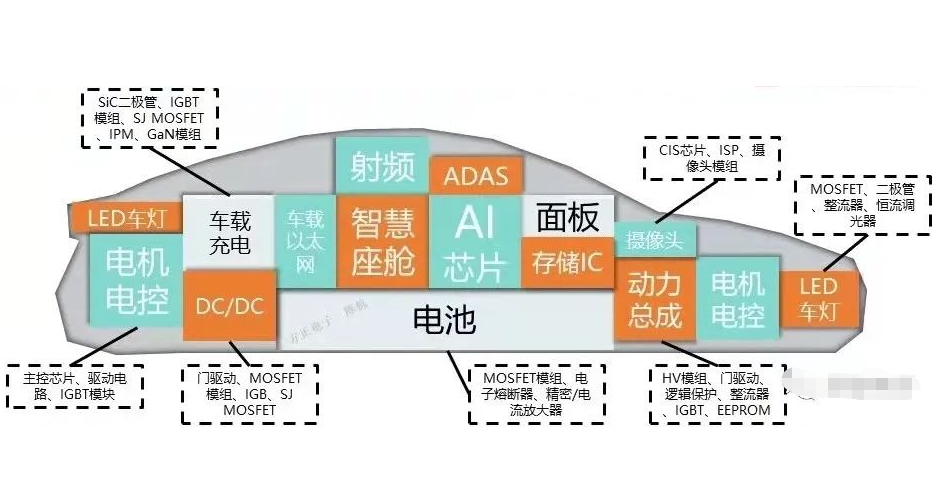 功率半導(dǎo)體是電子裝置中電能轉(zhuǎn)換與電路控制的核心,主要用于改變電子裝置中電壓和頻率、直流交流轉(zhuǎn)換等。在新能源汽車中,中高壓MOSFET單車平均用量提升至200個(gè)以上。
