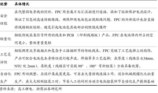 相較銅線線束,FPC 由于其高度集成、超薄厚度、超柔軟度等特點,在安全性、輕量化、布局規(guī)整等方面具備突出優(yōu)勢,此外 FPC 厚度薄,電池包結構定制,裝配時可通過機械手臂抓取直接放置電池包上,自動化程度高,適合規(guī)?;笈可a,FPC 替代銅線線束趨勢明確。
