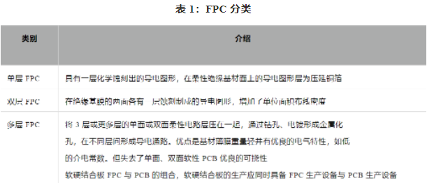 柔性電路板(FPC,Flexible Printed Circuit)是以柔性覆銅板為基材制成的一種電路板,作為信號傳輸的媒介應用于電子產品的連接,具備配線組裝密度高、彎折性好、輕量化、工藝靈活等特點。FPC一般可分為單層 FPC、雙層 FPC、多層 FPC 和軟硬結合版。