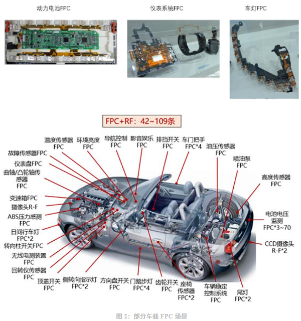 隨著汽車電動化、智能化發(fā)展,FPC在彎折性、減重、自動化程度高等優(yōu)勢進一步體現,FPC 在車載領域的用量不斷提升,應用涵蓋車燈、顯示模組、BMS/VCU/MCU 三大動力控制系統(tǒng)、傳感器、高級輔助系統(tǒng)等相關場景。新能源汽車的大發(fā)展帶動車載動力電池用 FPC 需求大幅增長。