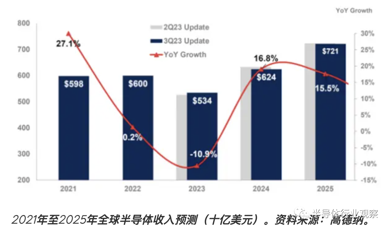 但根據(jù)Gartmer目前的預(yù)計(jì),在 16.8% 的強(qiáng)勁增長(zhǎng)之后,2025 年全球芯片銷(xiāo)售額將增長(zhǎng) 15.5%,達(dá)到 7,210 億美元。值得一提的是,Gartner 還表示,全球芯片市場(chǎng)到 2023 年將下降 11%。