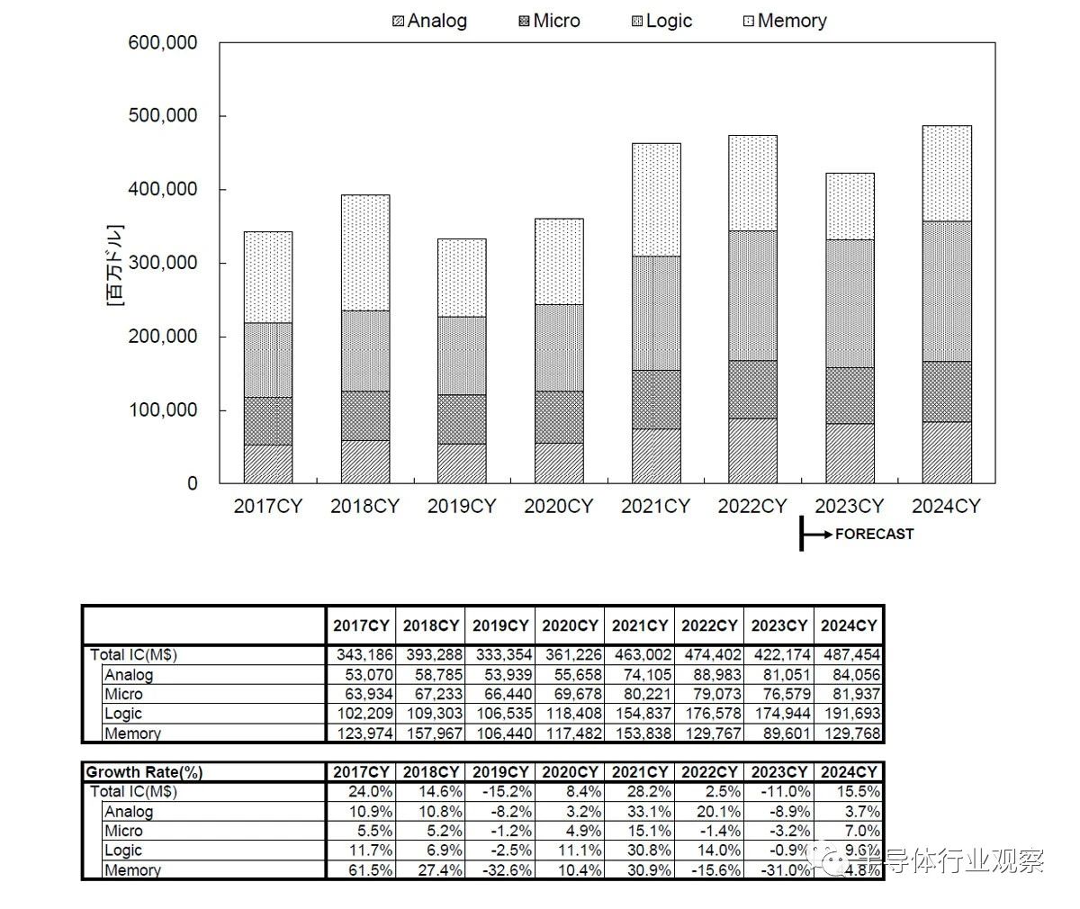 2024年按產(chǎn)品類(lèi)別劃分的市場(chǎng)規(guī)模如下:分立半導(dǎo)體將增長(zhǎng)4.2%至375億美元,光電子將增長(zhǎng)1.7%至433億美元,傳感器和執(zhí)行器將增長(zhǎng)3.7%至201億美元,整體IC將增長(zhǎng)增長(zhǎng)3.7%至201億美元,預(yù)計(jì)同比增長(zhǎng)15.5%至4875億美元。此外,IC細(xì)分包括存儲(chǔ)器將增長(zhǎng)44.8%、邏輯將增長(zhǎng)9.6%、微處理器/控制器、預(yù)計(jì)將增長(zhǎng) 7.0%,模擬銷(xiāo)售額將增長(zhǎng) 3.7%。