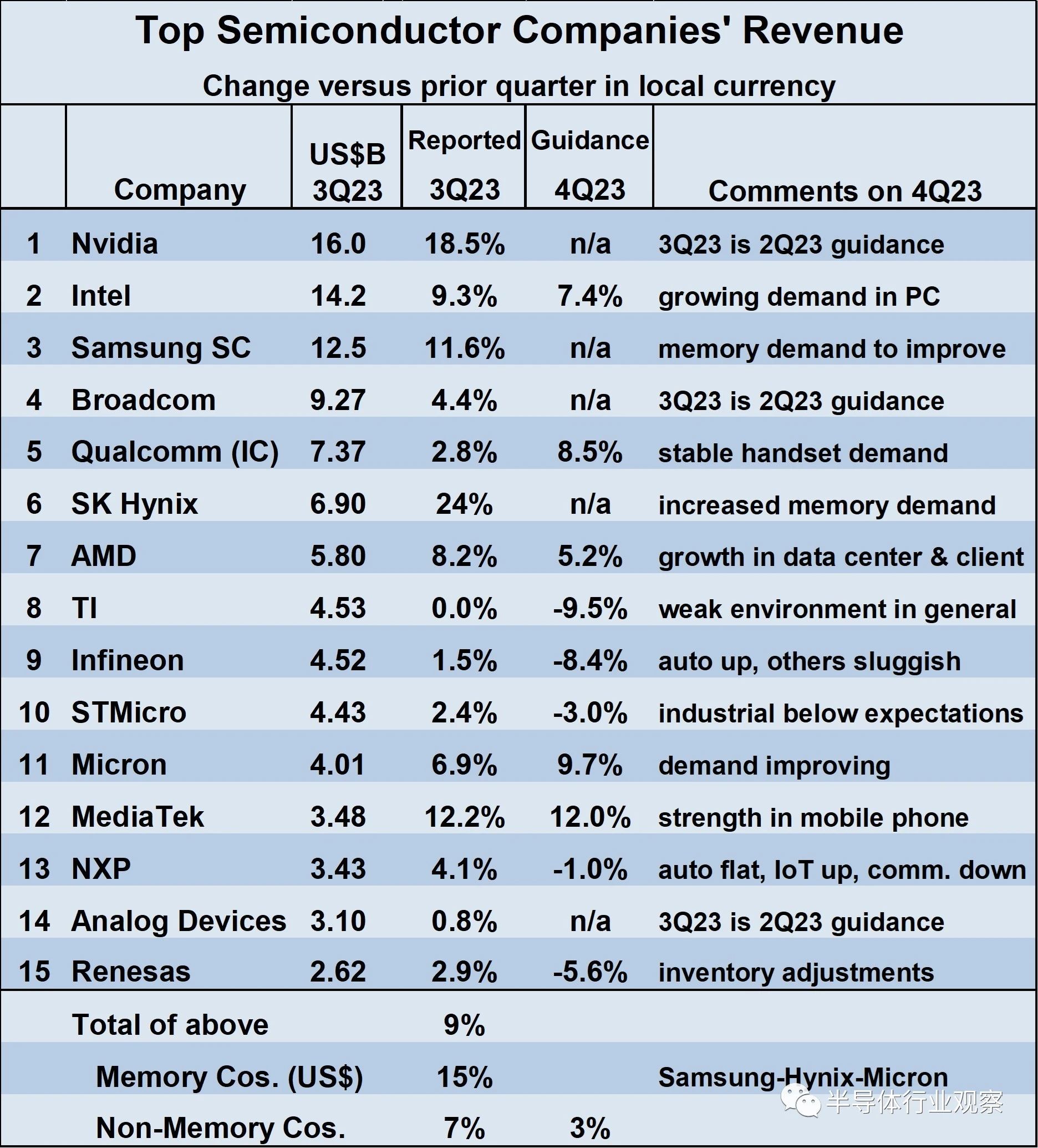 排名前 15 的半導(dǎo)體公司第三季度營(yíng)收均較第二季度有所增長(zhǎng)。德州儀器 (Texas Instruments) 和 Analog Devices 的增長(zhǎng)率不到 1%,而英偉達(dá) (Nvidia)、三星 (Samsung)、SK 海力士 (SK Hynix) 和聯(lián)發(fā)科 (Media Tek) 的增長(zhǎng)率則達(dá)到兩位數(shù)。