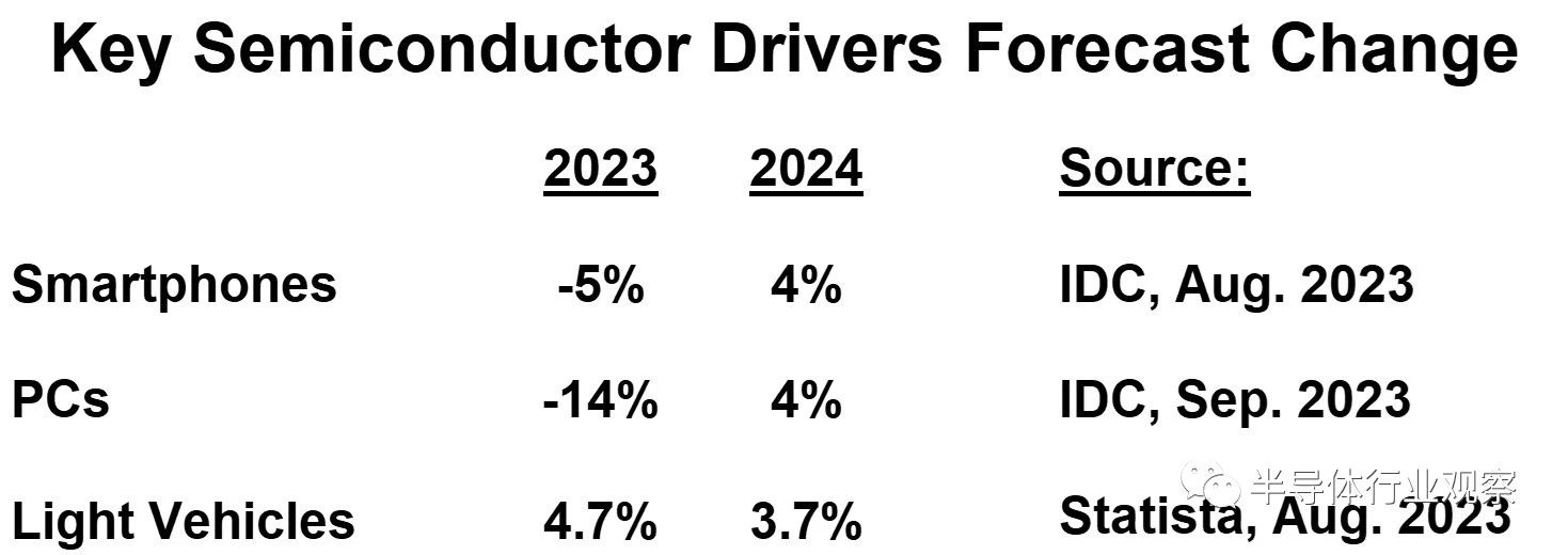 IDC 預(yù)測(cè),智能手機(jī)銷(xiāo)量在 2023 年下降 5% 后,到 2024 年將增長(zhǎng) 4%。IDC 預(yù)計(jì) PC 銷(xiāo)量在 2023 年急劇下降 14% 后,在 2024 年將增長(zhǎng) 4%。相比之下,根據(jù) Statista 的數(shù)據(jù),輕型汽車(chē)產(chǎn)量的增長(zhǎng)將從 2023 年的 4.7% 放緩至 2024 年的 3.7%。