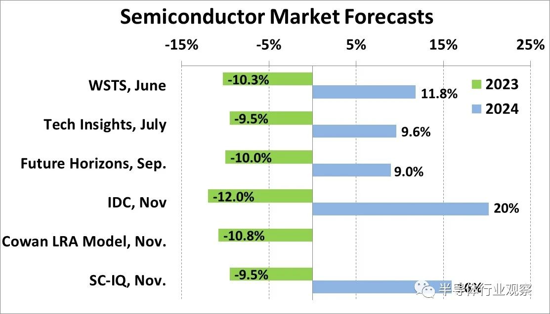 對(duì) 2023 年半導(dǎo)體市場(chǎng)變化的預(yù)測(cè)將在 -9% 至 -12% 范圍內(nèi)。SI 預(yù)計(jì)最好的結(jié)果是負(fù) 9.5%。進(jìn)入 2024 年的勢(shì)頭十分明顯。Future Horizons 對(duì) 2024 年的預(yù)測(cè)為健康的 9%,IDC 的預(yù)測(cè)為強(qiáng)勁的 20%。SI 的預(yù)測(cè)是增長(zhǎng) 16%。